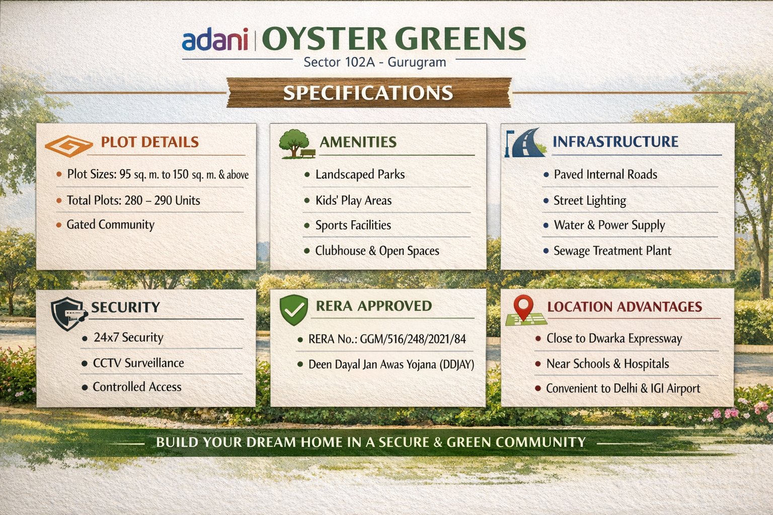 Adani Oyster Greens is a thoughtfully planned residential plotted development located in Sector 102A, Gurugram, close to the rapidly developing Dwarka Expressway. Developed by Adani Realty in collaboration with M2K Group under Adani M2K Projects LLP, this project is part of the Deen Dayal Jan Awas Yojana (DDJAY), offering legally approved freehold plots.