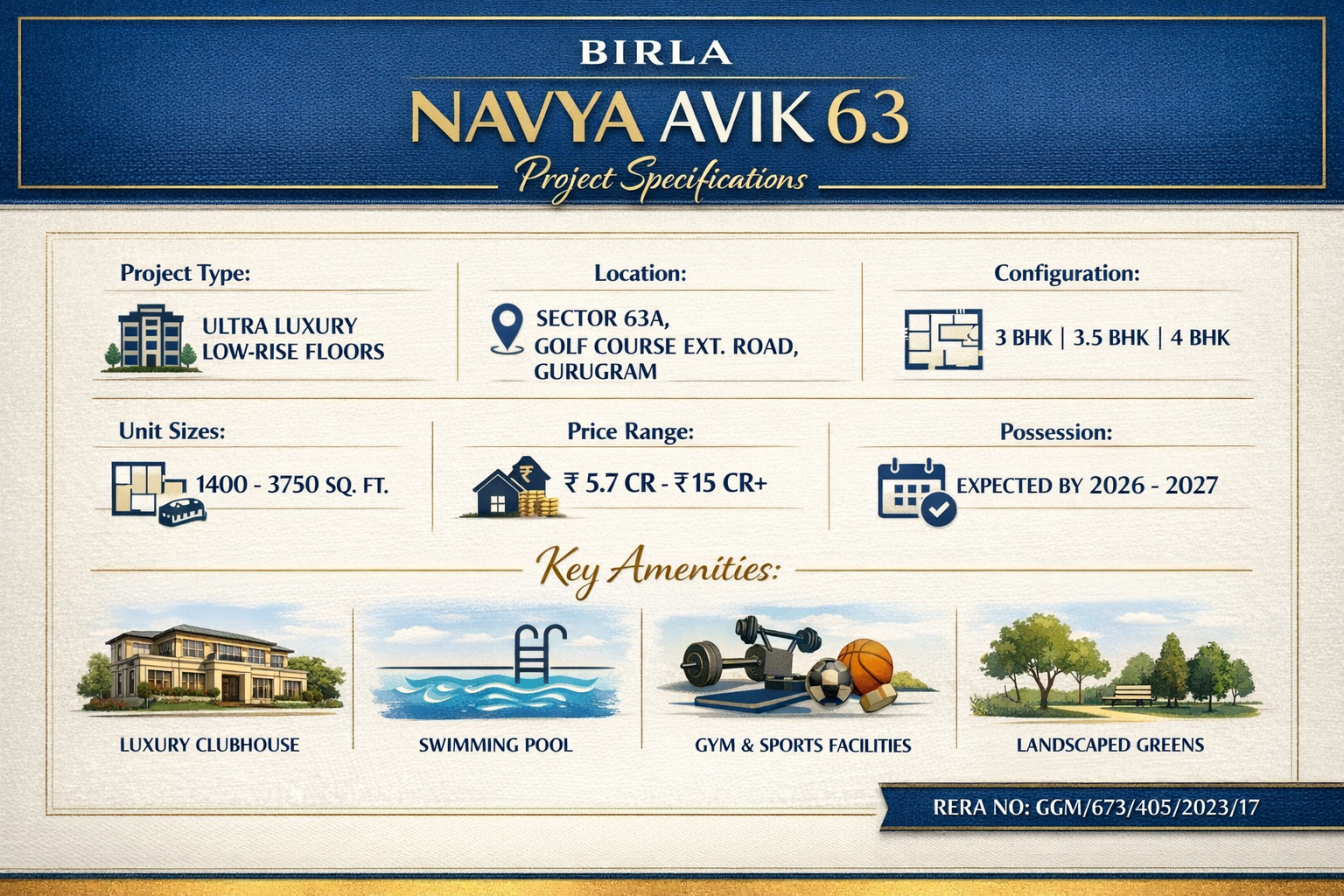 Birla Navya Avik 63 Gurugram is an exclusive low-rise luxury residential project by Birla Estates, located in the heart of Gurugram. Strategically positioned in Sector 63, Golf Course Extension Road, this premium development offers thoughtfully designed 3 BHK and 4 BHK luxury floors crafted for modern urban families seeking privacy, security, and community living.