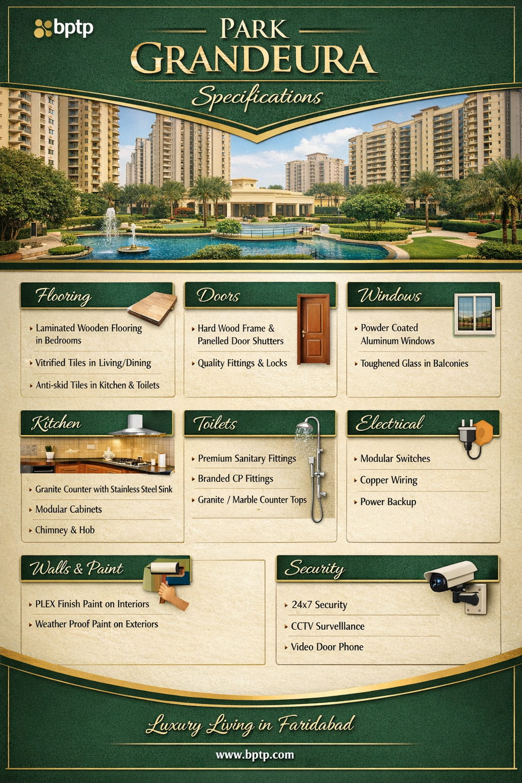 BPTP Park Grandeura Sector 82 Faridabad is a premium residential apartment project by BPTP Group, located in the fast-developing Greater Faridabad (Neharpar) region. Designed for modern families, the project offers well-planned 2 BHK and 3 BHK apartments with spacious layouts and contemporary design.