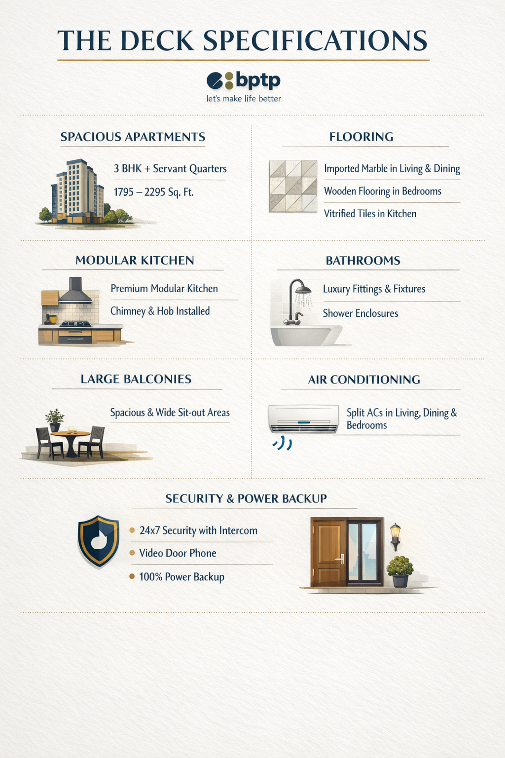 The homes at BPTP The Deck are designed with spacious interiors, large balconies, and ample natural ventilation, ensuring a bright and refreshing atmosphere throughout the day. Each unit reflects attention to detail, quality construction, and efficient space utilization. The project promotes a low-density living environment, allowing residents to enjoy peace and exclusivity within a secure gated community.