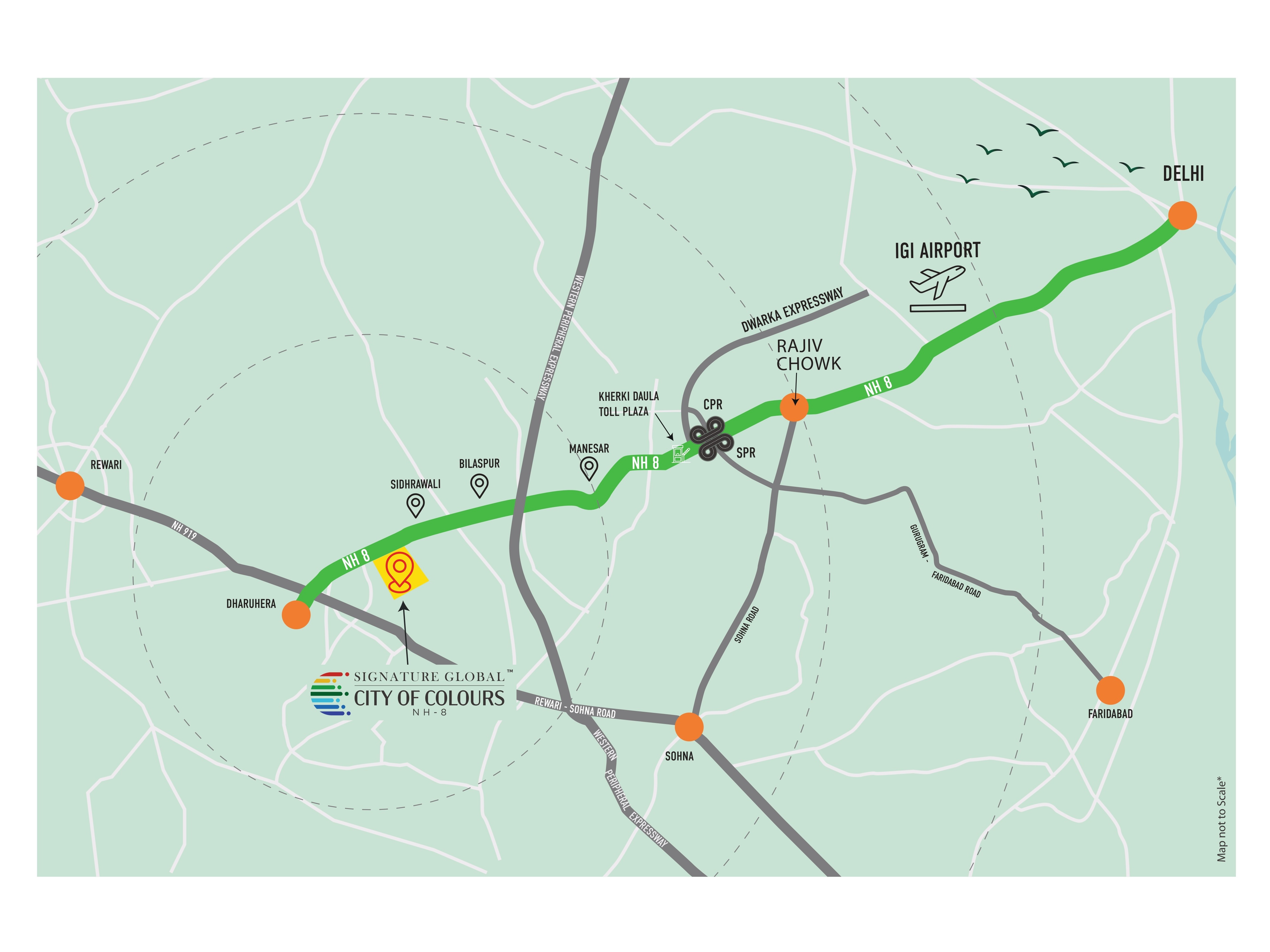 Signature Global City of Colours NH-8 enjoys seamless road connectivity to Gurugram, Manesar Industrial Area, Rewari, and Jaipur. Its proximity to NH-48 makes daily commuting convenient, while upcoming infrastructure developments further enhance the area’s growth potential. Schools, hospitals, retail markets, and employment hubs are located nearby.